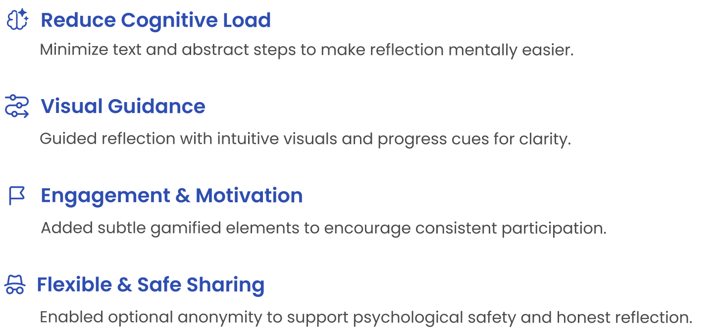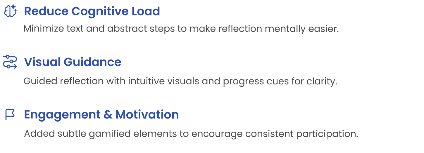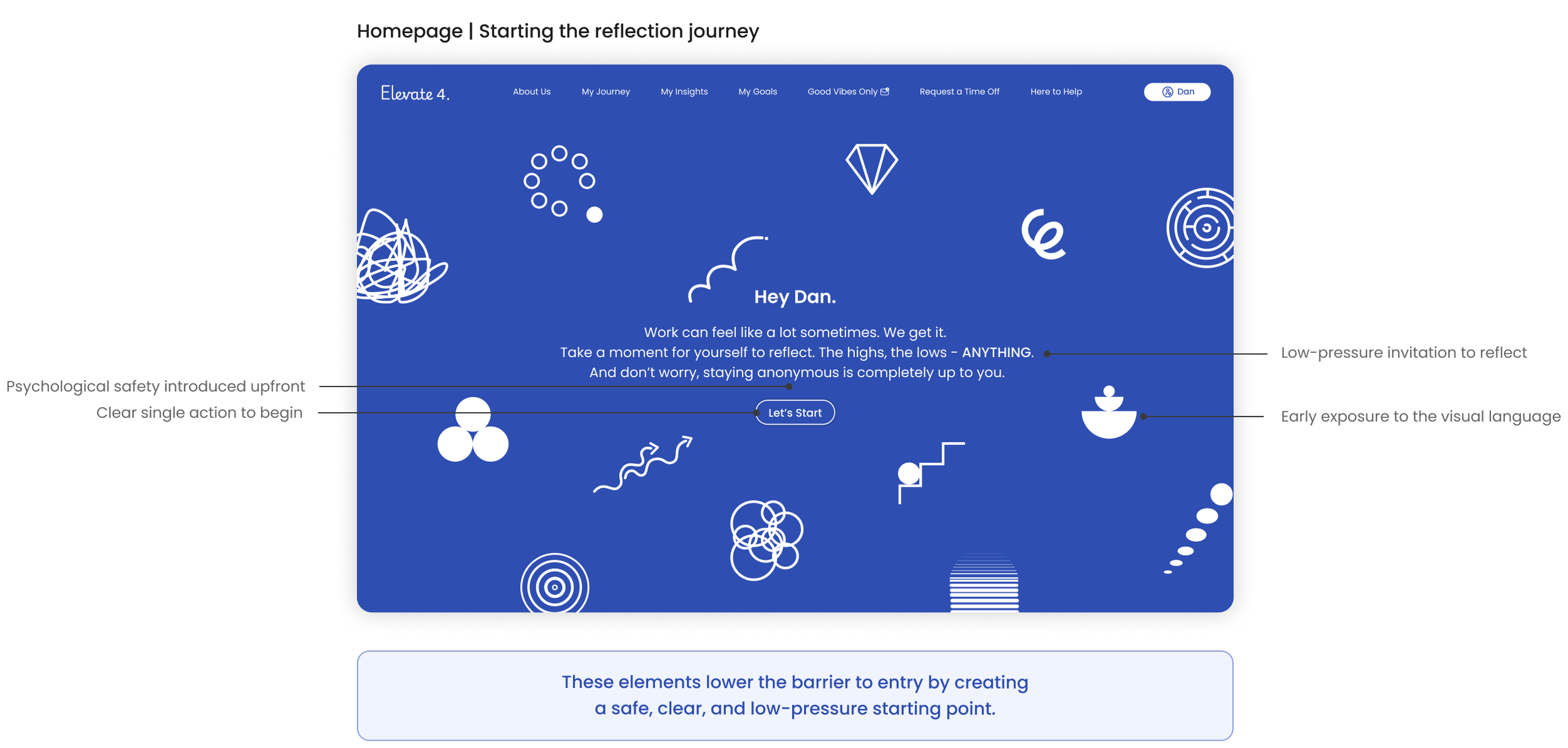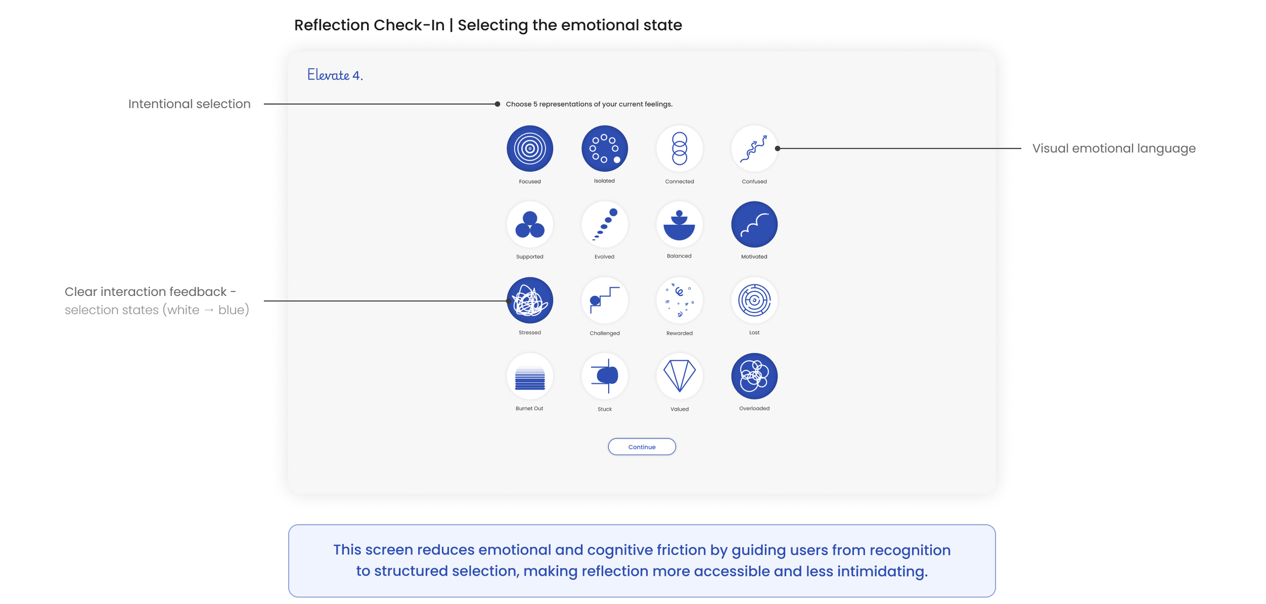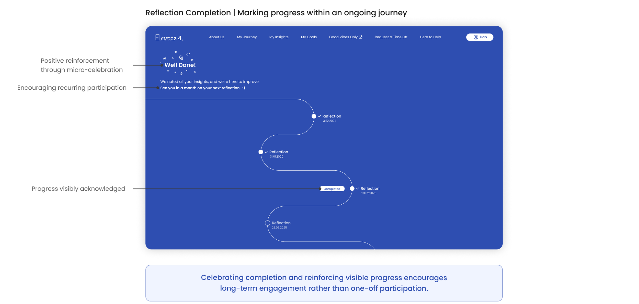 Elevate 4 reimagines workplace reflection as a structured, emotionally safe system rather than a one-off survey. By reducing friction, introducing visual emotional language, and reinforcing progress through clear milestones, the experience supports intentional participation and long-term engagement.